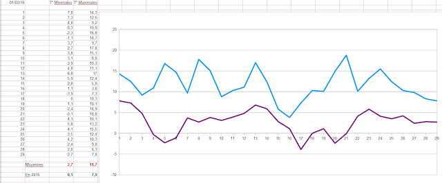 L'augmentation des températures par rapport à 2015 est toujours sensible; + 2°6 pour les minimales et + 3°8 pour les maximales.Le réchauffement semble même s'accentuer.